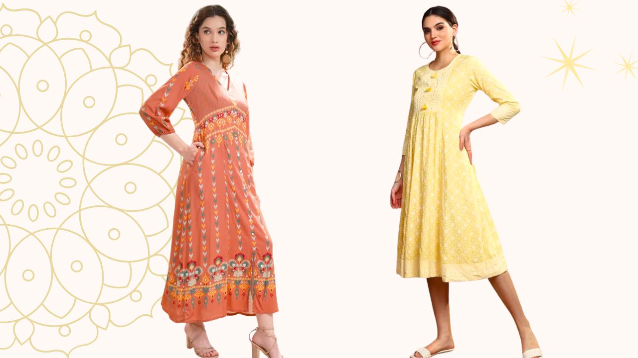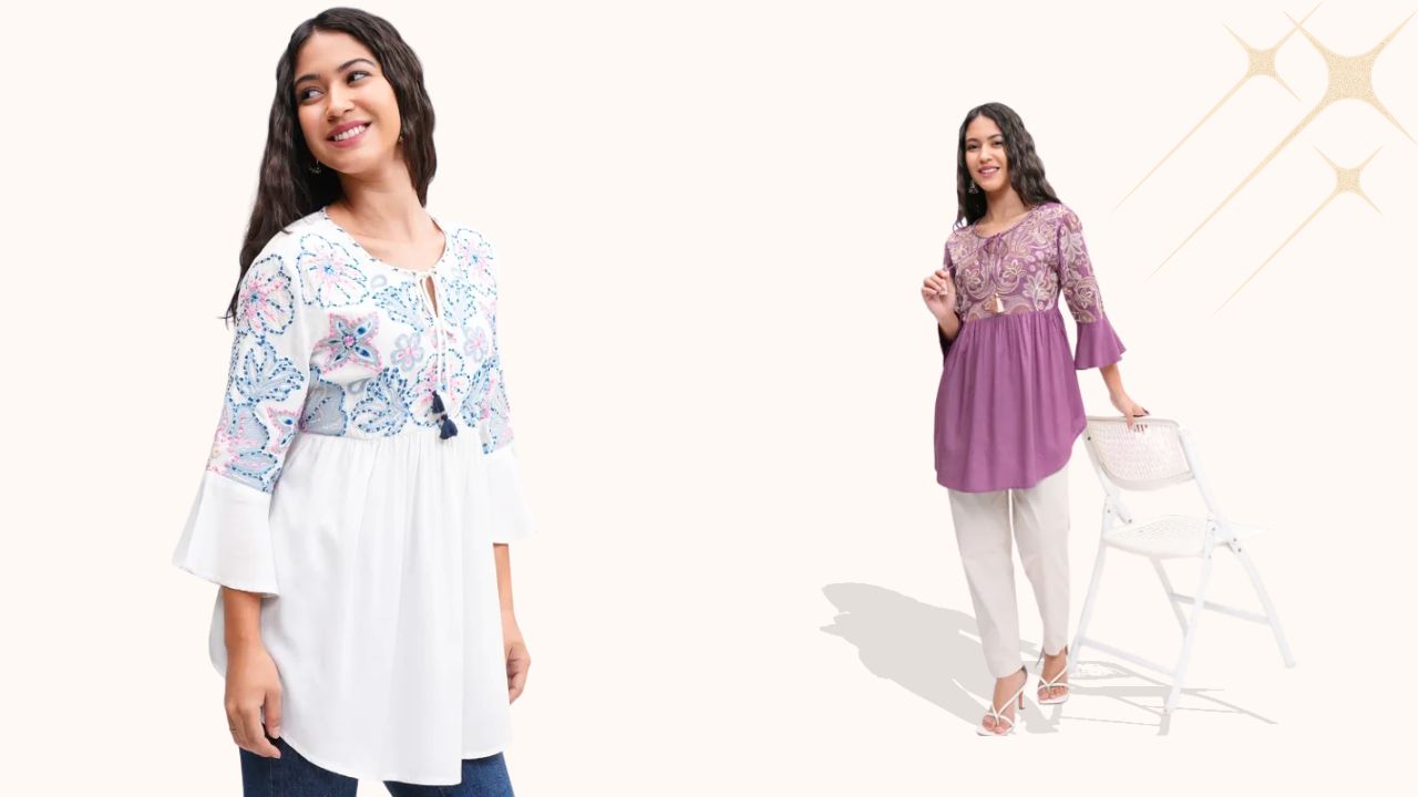 These trending ethnic tops bring a unique charm when paired with jeans–you’ve probably seen girls flexing these looks on your feed. Style a shiny or bold-shaded A-line top with blue denim for a balanced, neutral tone. After all, with bright lights and stylish divas everywhere, your outfit deserves to shine brighter.