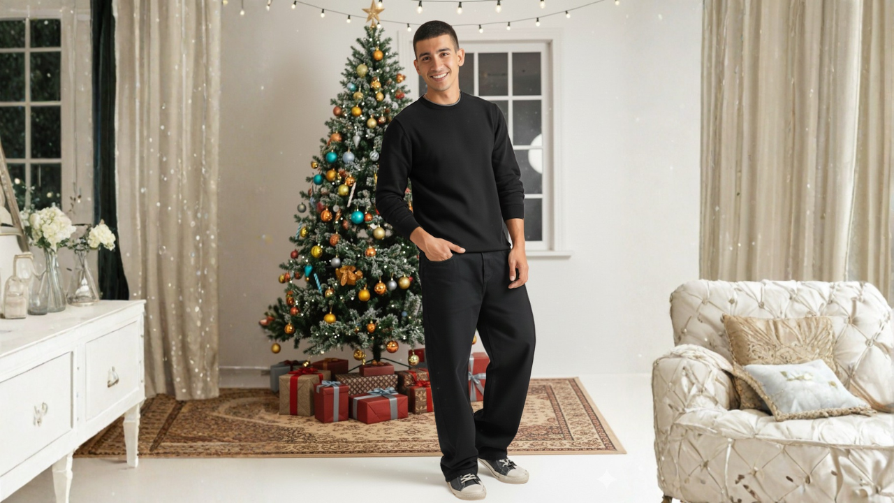 The vibe is festive, but your outfit doesn’t need to be loud either. That’s where a monochrome look comes in. A pair of well-fitted dark trousers and a clean, solid-colour sweater instantly make you look sharp and put-together. While everyone else is mixing prints and colours, your single-tone outfit keeps things calm and stylish.
